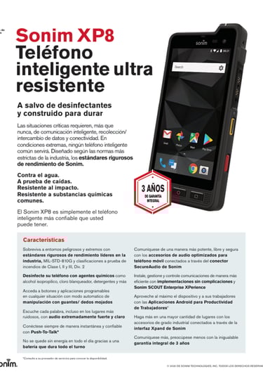 El Sonim XP8 es un teléfono inteligente robusto diseñado para resistir condiciones extremas, construido para ser extremadamente resistente, es a prueba de agua, polvo y golpes. Cumple con los estándares militares MIL-STD-810G y tiene certificación IP68.